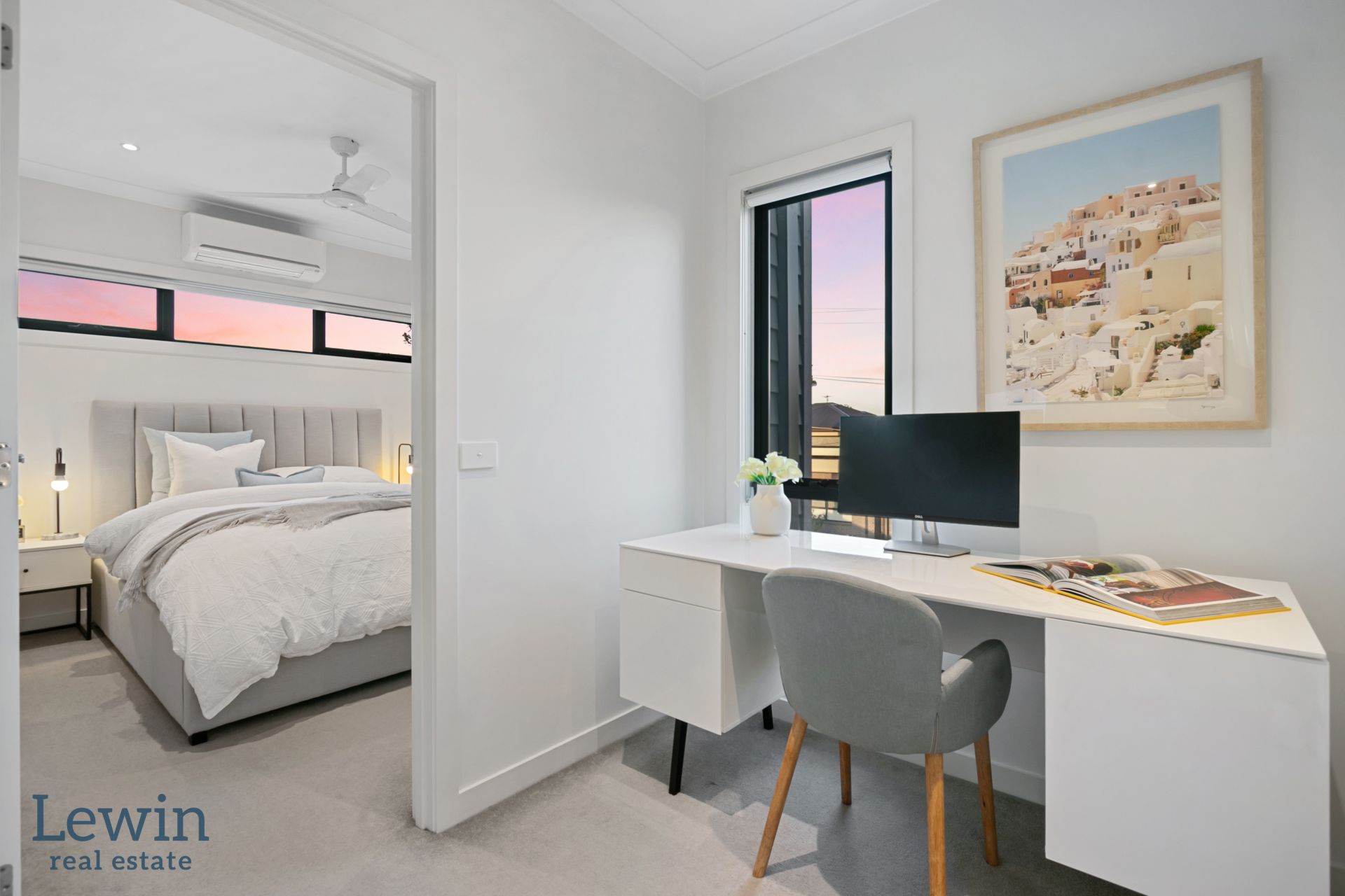 All three bedrooms are tucked away upstairs, away from the home’s social hub. Flanking a handy landing study nook, they each boast fitted wardrobes, including the ensuited primary bedroom which has the luxury of walk-in storage.