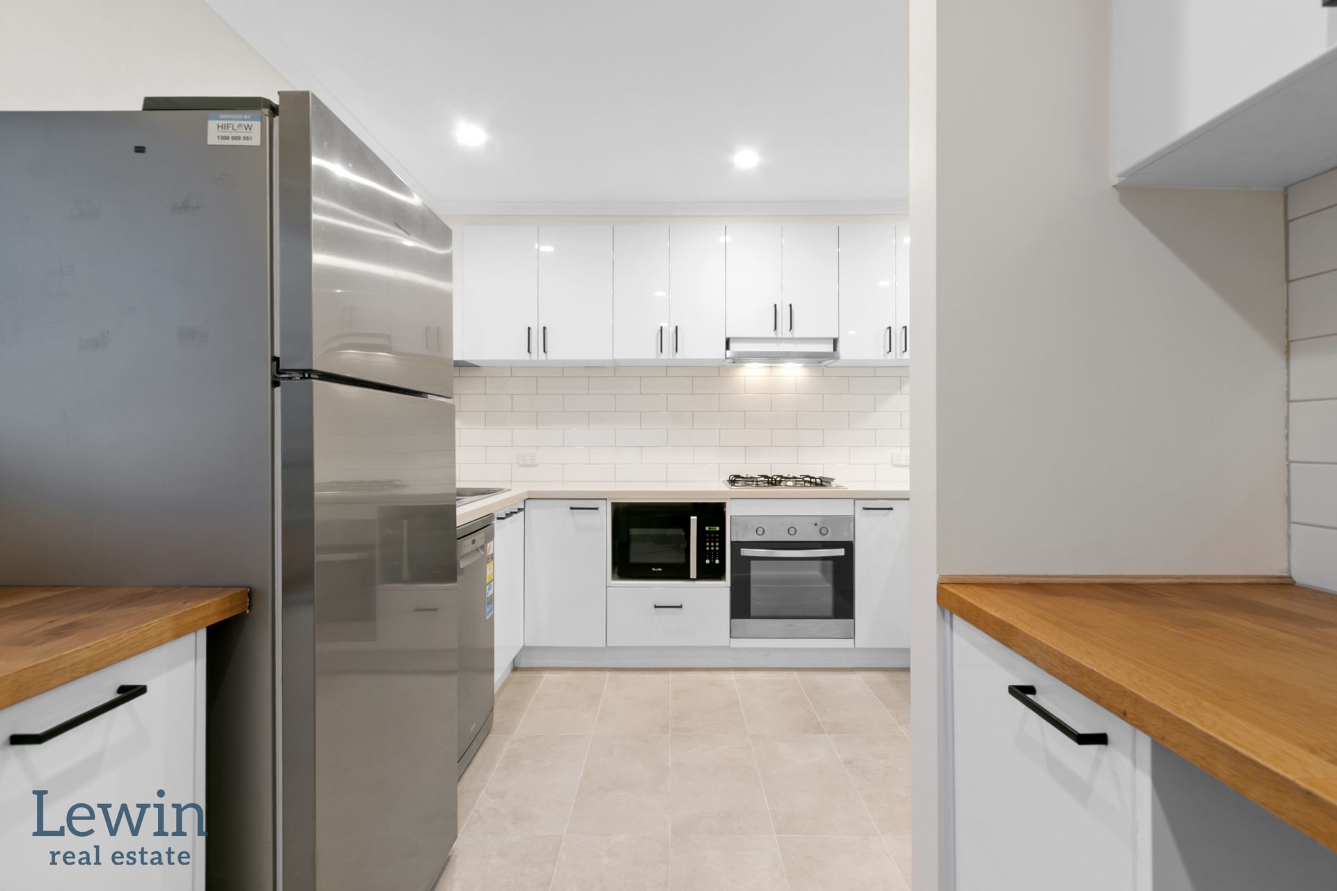 An inviting living/dining area welcomes guests, while the sophisticated gourmet kitchen showcases crisp stone benchtops and quality appliances, including a gas cooktop and stainless steel dishwasher.