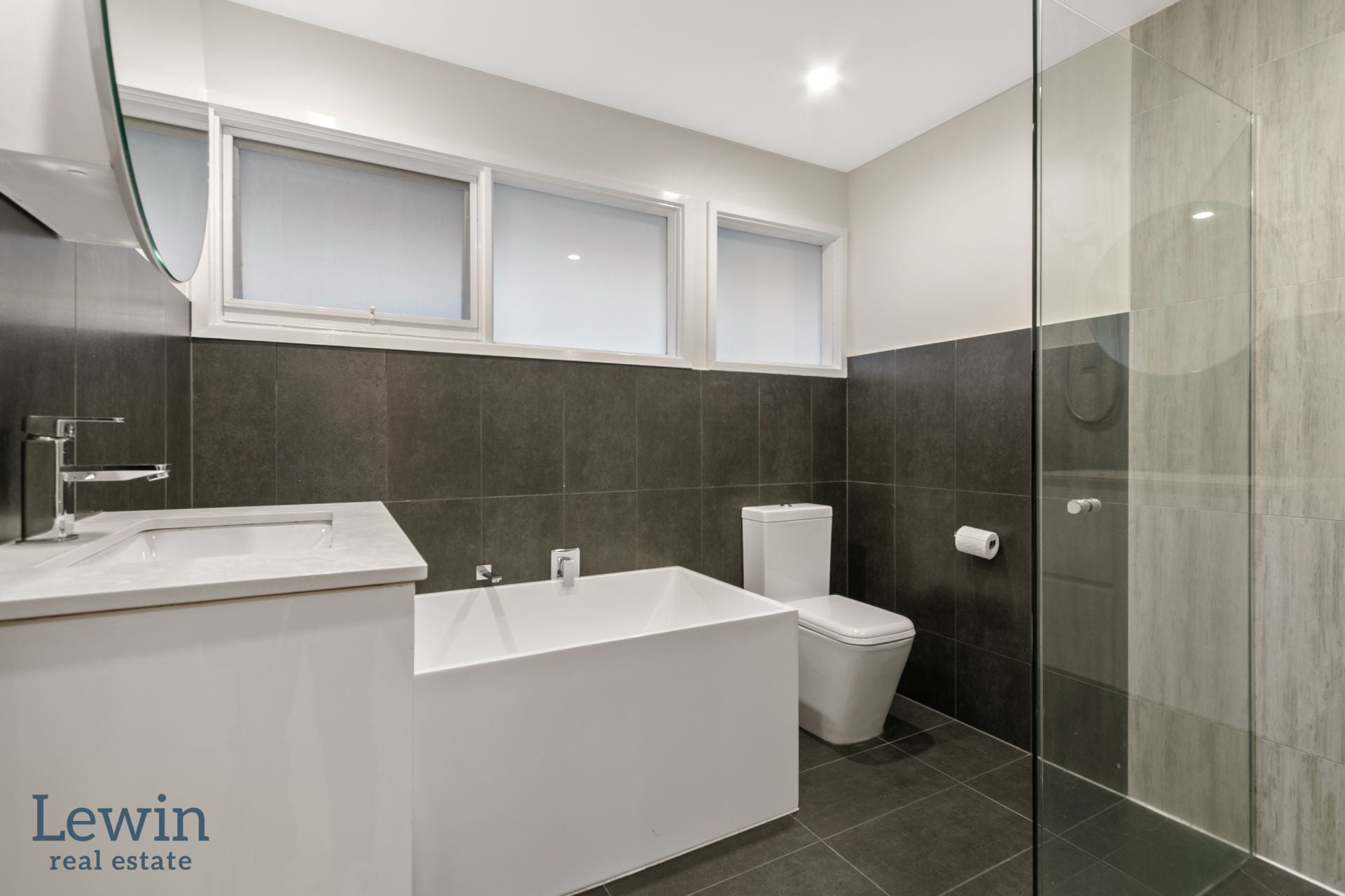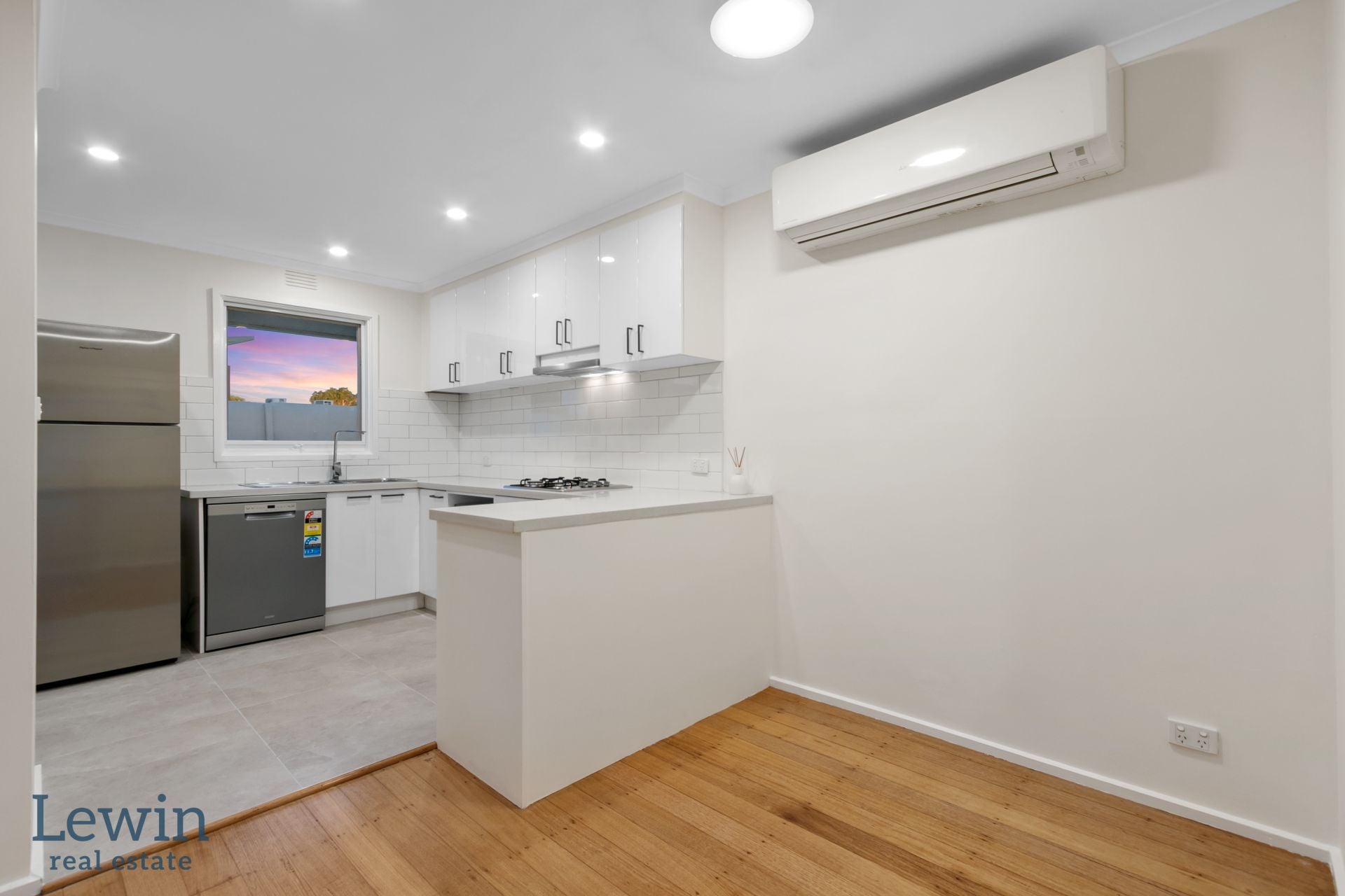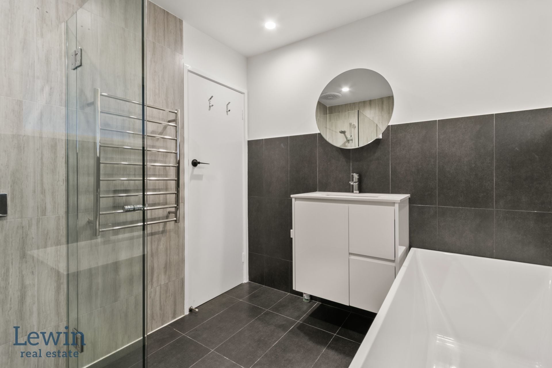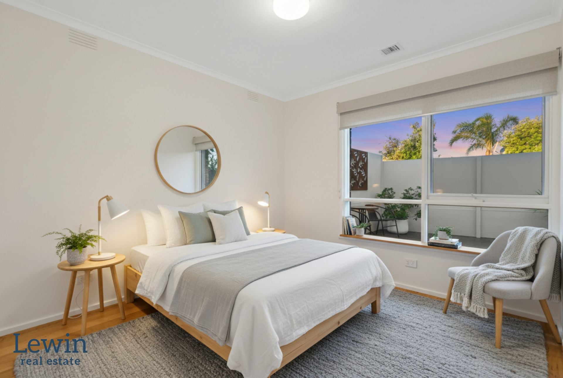 The sophisticated finishes continue in the smartly appointed bathroom, where a sumptuous tub, frameless glass shower and mirrored storage are all highlights. Both bedrooms benefit from built-in mirrored wardrobes while a full laundry and split system heating/cooling complete the interiors.